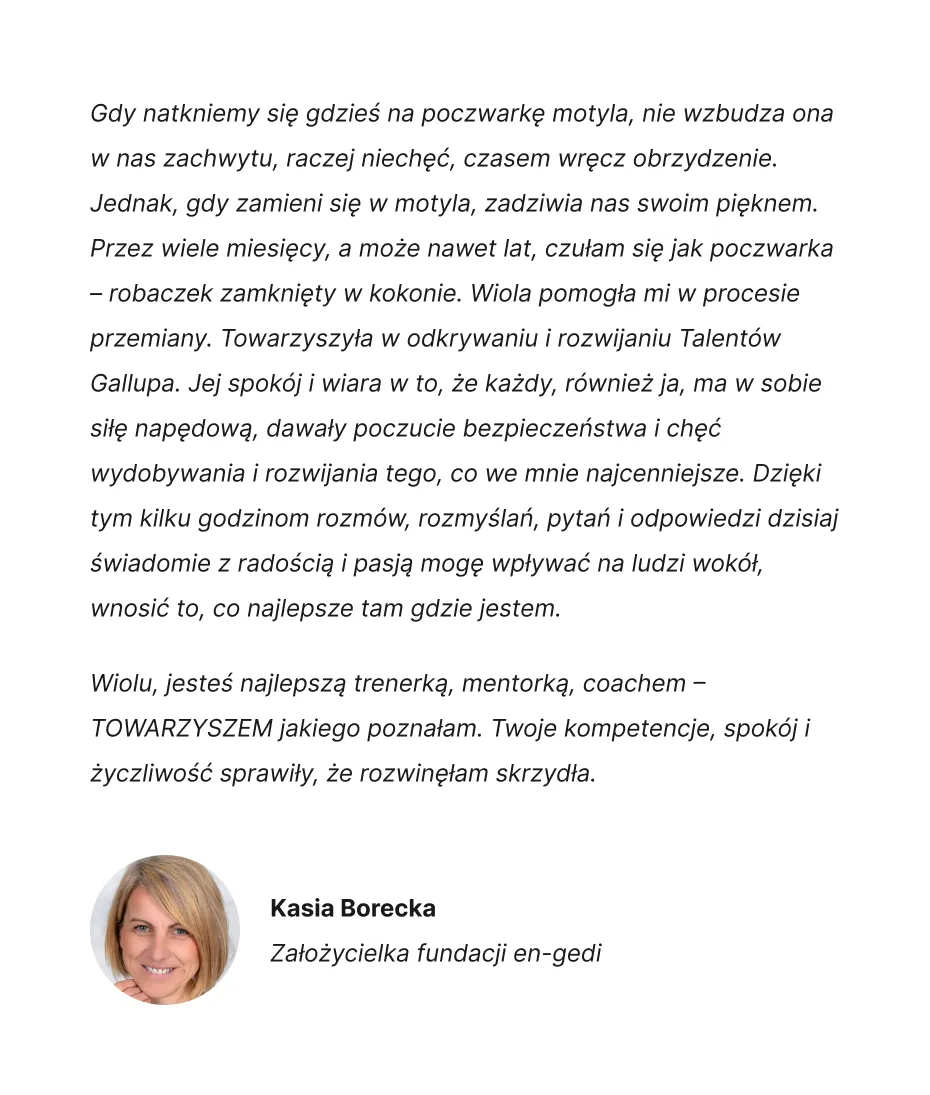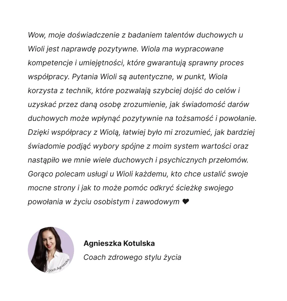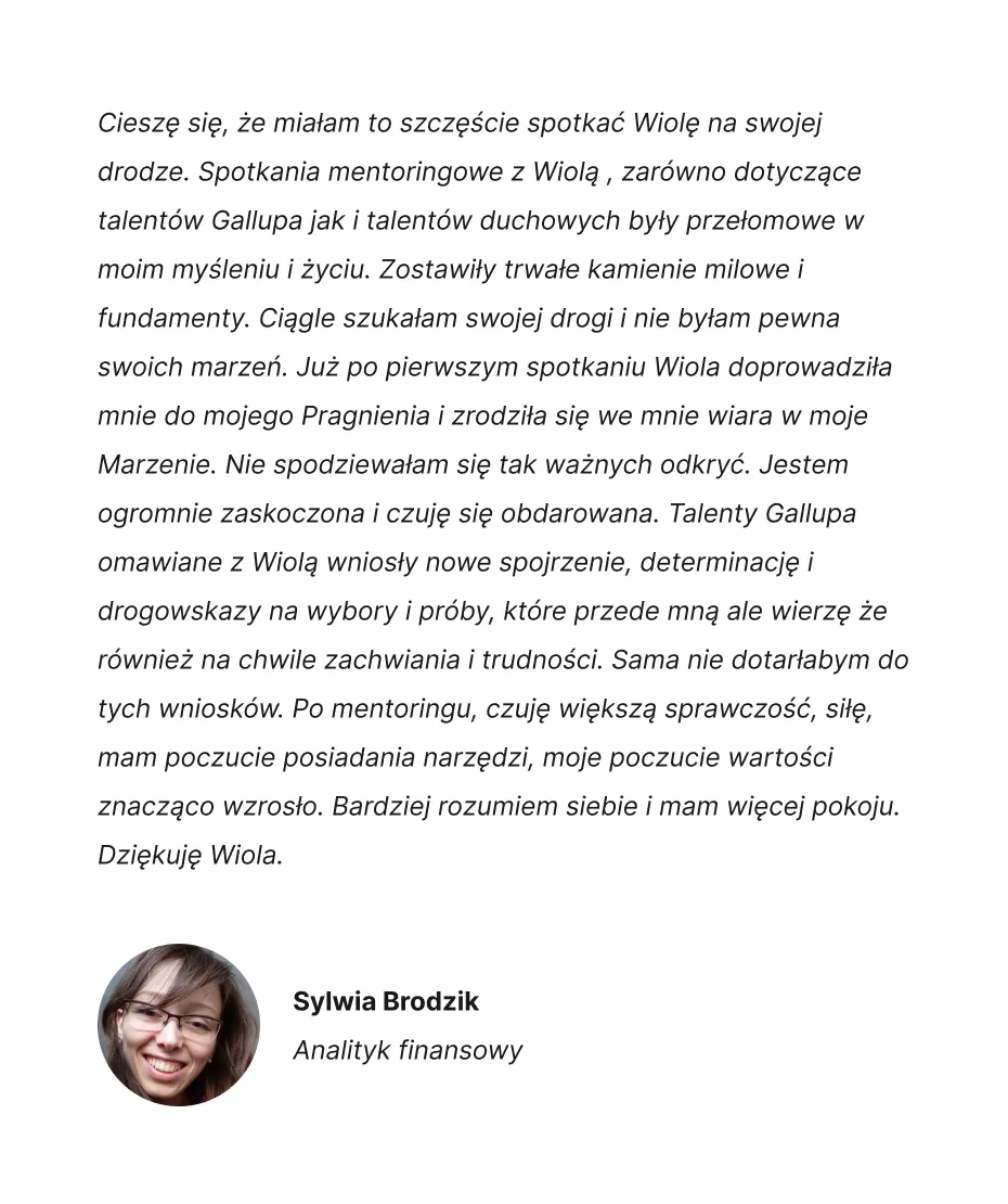 Jestem certyfikowanym trenerem talentów Gallupa i talentów duchowych. Łączę pracę z talentami, duchowość, empatię i konkretne narzędzia, które naprawdę działają – w dodatku u każdego.