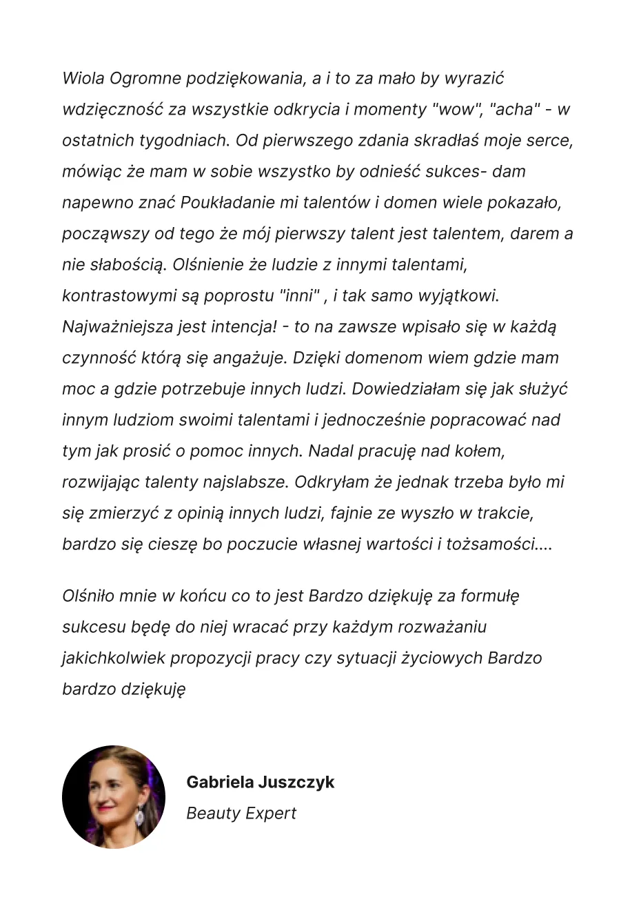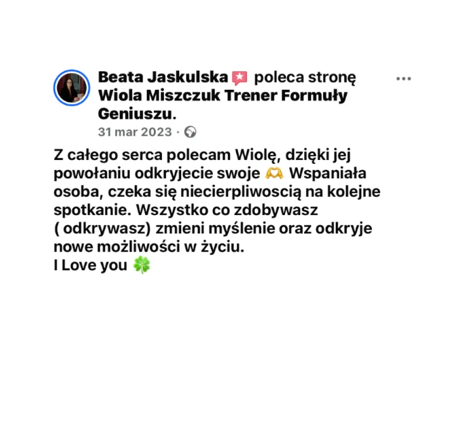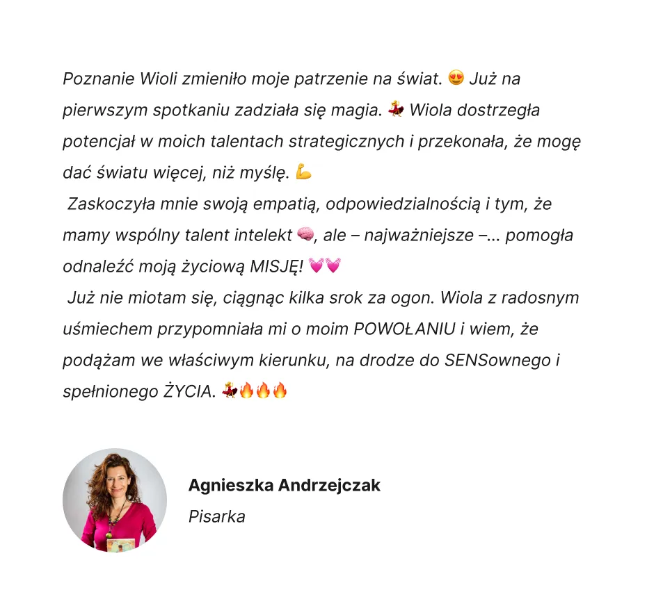 Nieznajomość siebie, swoich talentów, oraz blokujące przekonania powodują, że nie mogą spełnić się w tym, do czego zostały powołane. A moją misją jest pomóc Tobie to zmienić. Jeśli jesteś jedną z takich osób, to wiedz, że skoro mnie i kobietom, którym już pomogłam, się udało, to Ty też odniesiesz sukces. Chcę tego z całego serca również dla Ciebie!